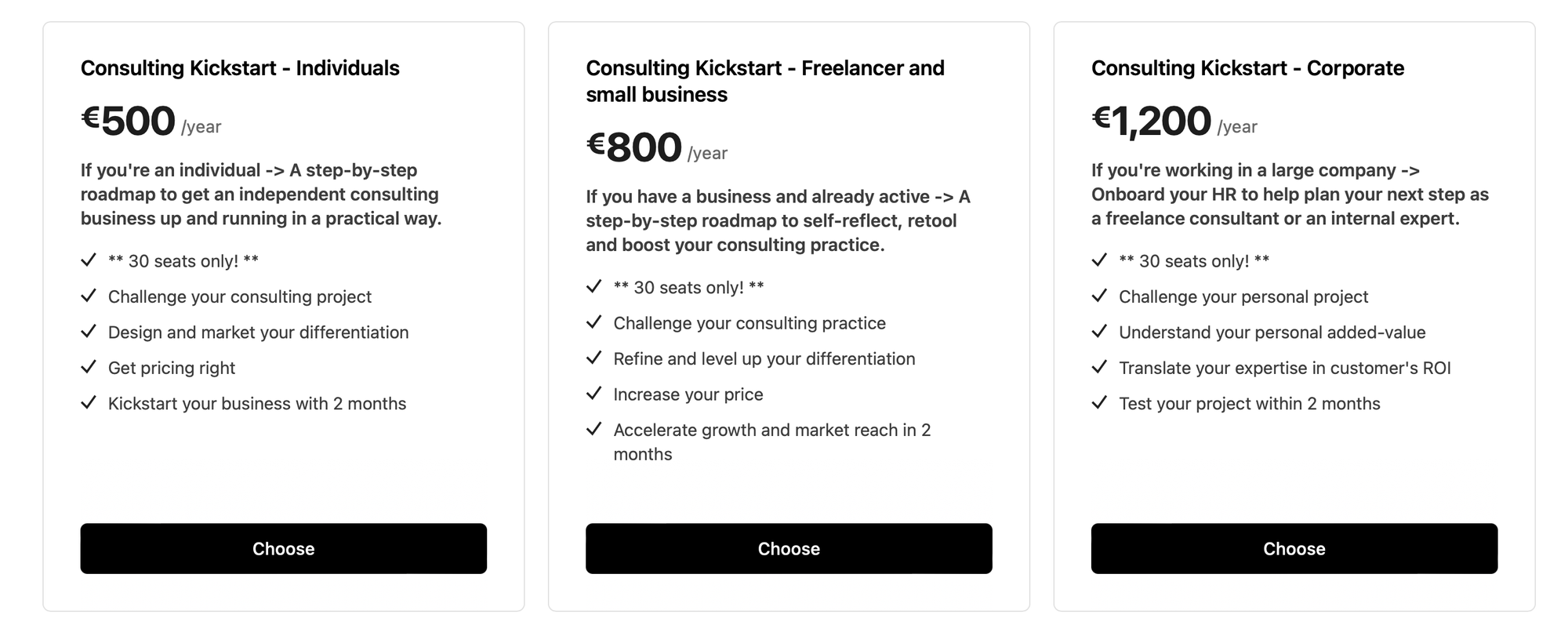 To my surprise, two of you even used the program to boost your position within large corporations as internal consultants (one even seized a new position opportunity and got a significant raise–see above). So, I'm also opening the program for these profiles this year.