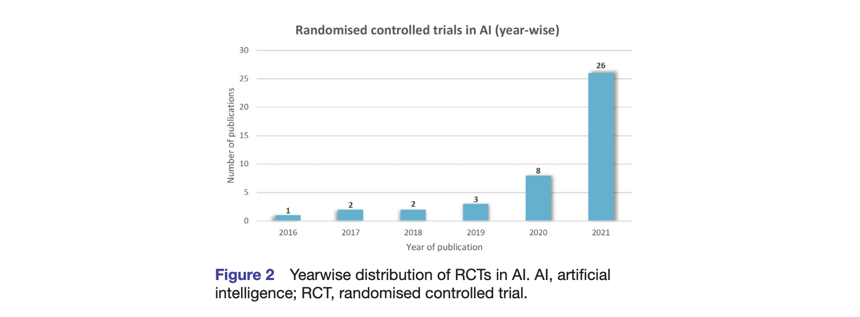 [1] Deborah Plana, Dennis L. Shung, Alyssa A. Grimshaw, et al. Randomized Clinical Trials of Machine Learning Interventions in Health CareA Systematic Review. JAMA Netw Open. 2022;5(9):e2233946. doi:10.1001/jamanetworkopen.2022.33946