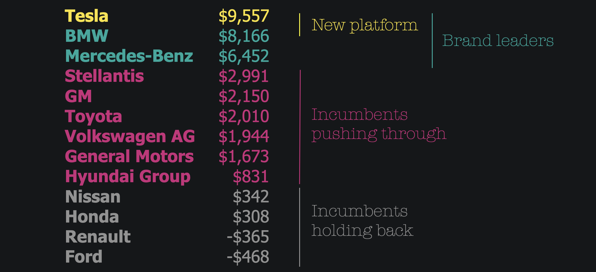 And suppose you only consider the margin advantage. In that case, you have a picture showing the new automotive platforms head and shoulders above everyone else (mainly Tesla mainly for now, but not for too long), German brand leaders that still command a premium on the market with mostly old engine platforms, a cohort of incumbents that started to invest late in the game in EVs that are struggling with margins but clawing back, and finally a long tail of incumbents that struggle both on their brand value and on their investments to jump back in the new EV market: