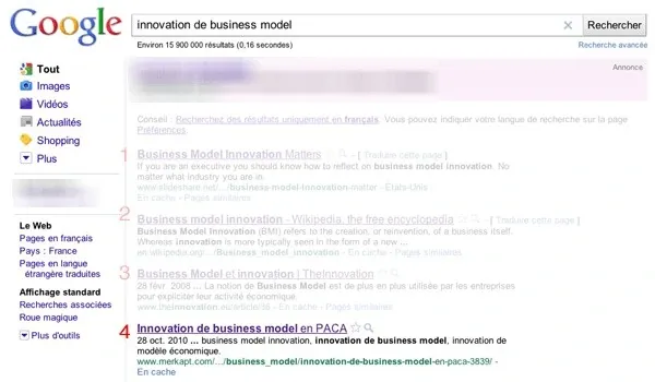 Nous obtenons un nuage d’intérêt assez significatif sur le web d’autant qu’il est très sélectif : je nettoie par exemple tous les mois les personnes que je suis sur Twitter, en enlevant les personnes qui se contentent uniquement de retweeter sans apporter de contenu, les webmarketeurs compulsifs et autre comptes sans intérêts. Sur Linkedin de même nous ne gardons que les gens avec qui nous avons une affinité ou un contact direct. Et pour ce qui est de merkapt.com nous ne faisons aucun backlink et ne comptons finalement que sur la qualité du contenu. Objectivement cela ne maximise pas nos chances d’avoir une bonne visibilité. Loin de là. Mais en contre-partie nous avons une excellente affinité avec notre “nuage 2.0”. Ceci étant dit, nous atteignons tout de même un référencement très honorable sur les sujets qui nous chers (même si ici la mention de PACA pourrait laisser croire que nous n’intervenons qu’en local, ce qui est très loin d’être le cas) :