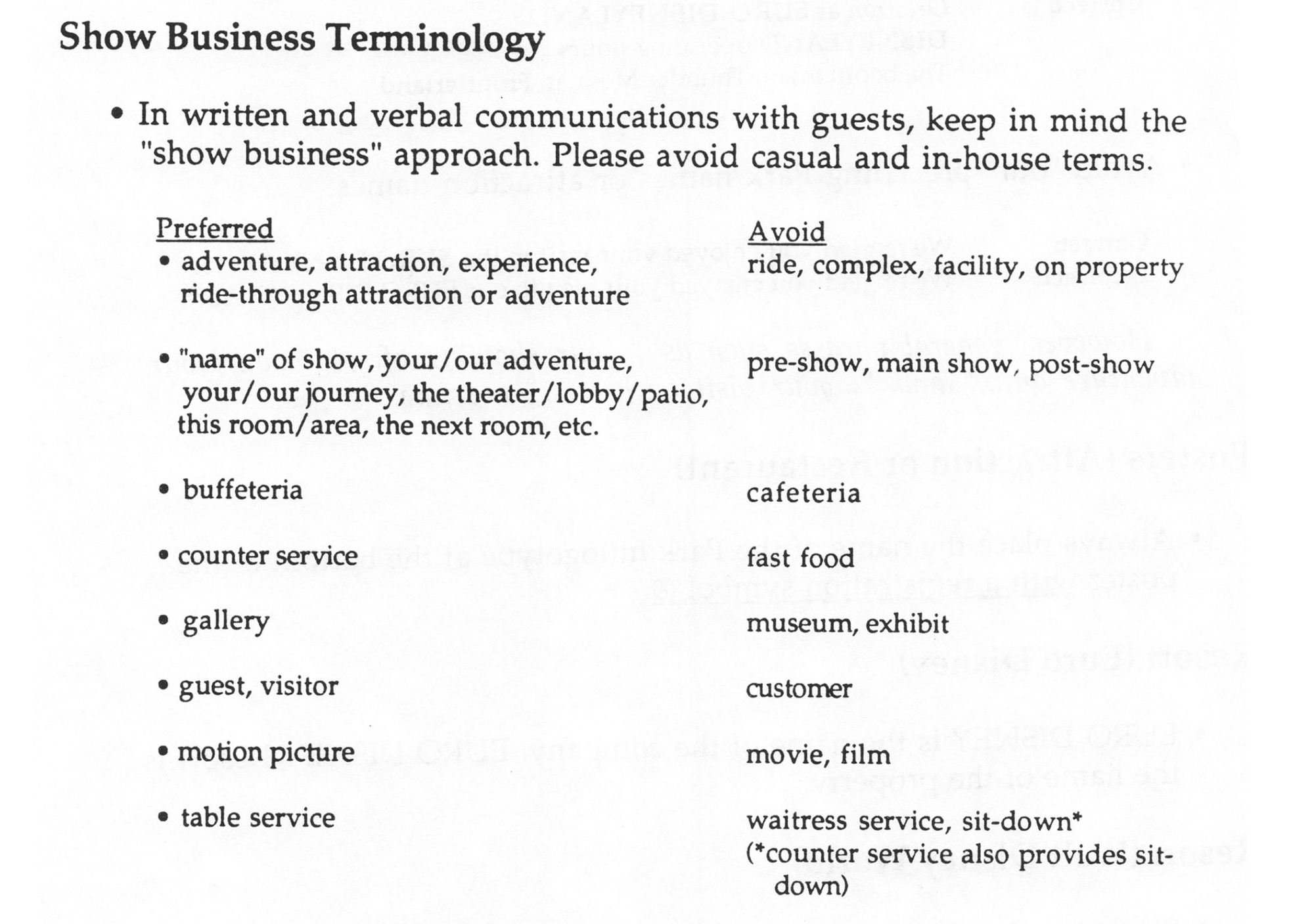 As a global brand that reinvented from scratch and "premiumized" the entertainment park experience, one of the amazing practices they pretty much invented was to ban specific terms from any form of communication while switching them for others that would focus their values: