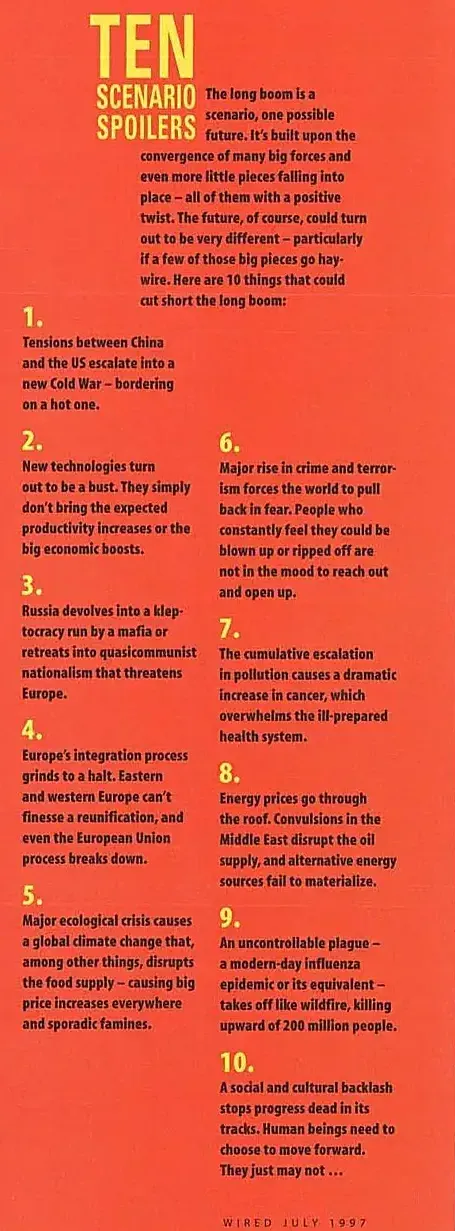 As some of you probably did, I got a blast from the past this week when an old 1997 article from Wired magazine resurfaced. The article was probably one of the first mainstream design fiction stories, painting a few scenarios for the future. One of the scenarios was called the Long Boom. It described how progress could turn wrong around a few critical events and place us in a dystopic future.