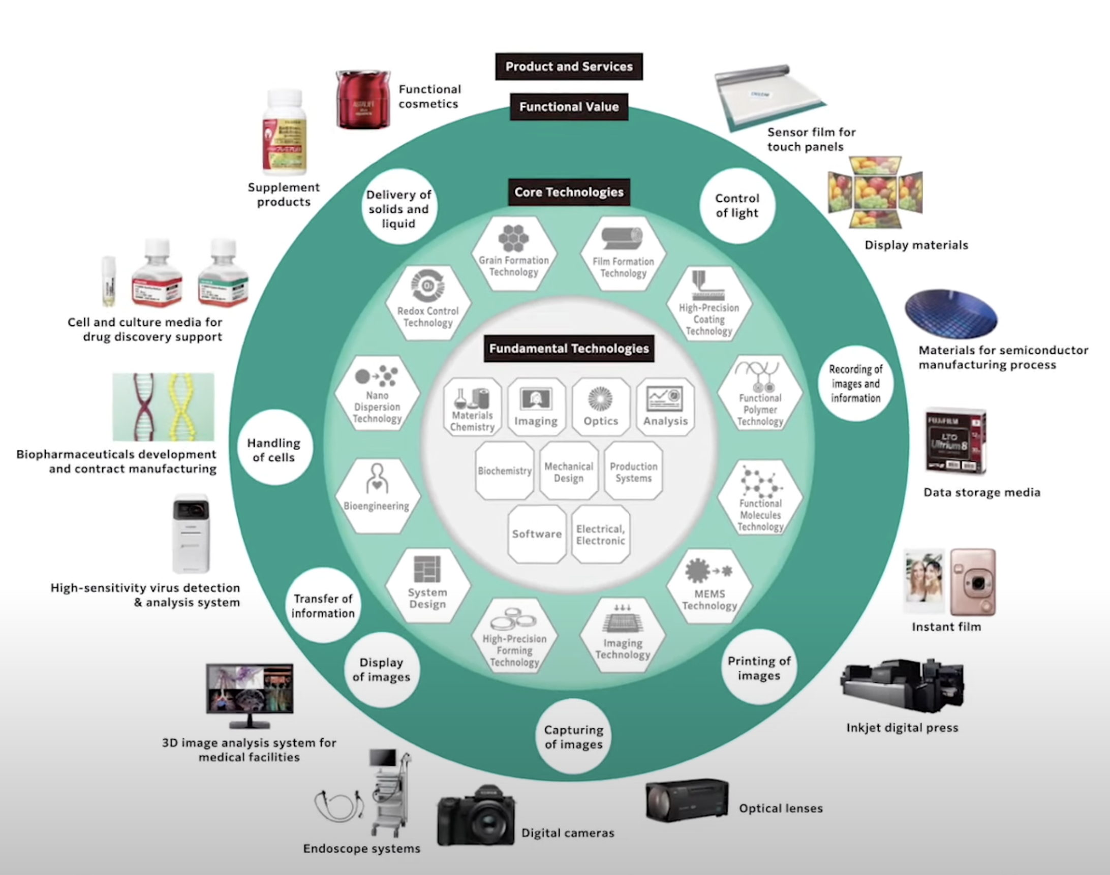From there, Fujifilm diversified further, penetrating the medical, printing, electronic imaging, and magnetic materials fields. The company invented computed radiography, which solved a number of issues of traditional radiography, resulting in a decrease of radiation exposure to both technician and patient.
