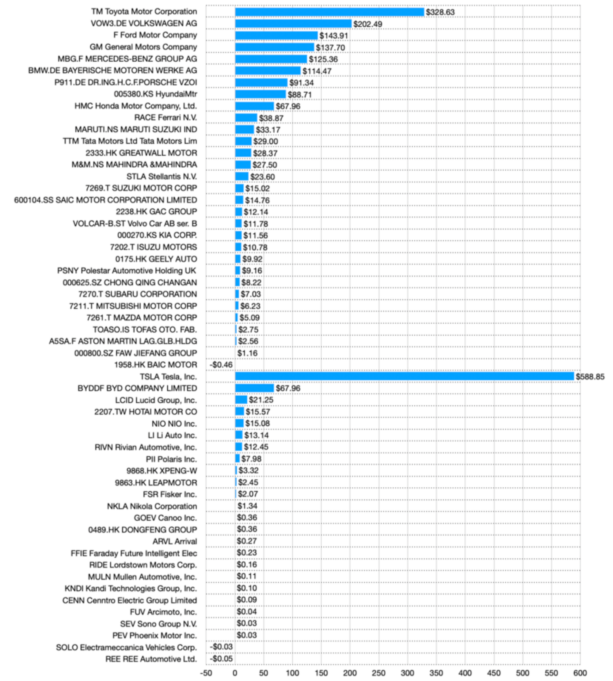 - The incumbents still weigh $1.6 trillion vs. "only" $753 billion for the entrants. This means that the automotive market is indeed past a tipping point and now transitioning to a new crop of actors. How fast the enterprise value of the new entrants will grow will map out how fast this transition happens – and, again, in such a slow market, it's an easy indicator to monitor.