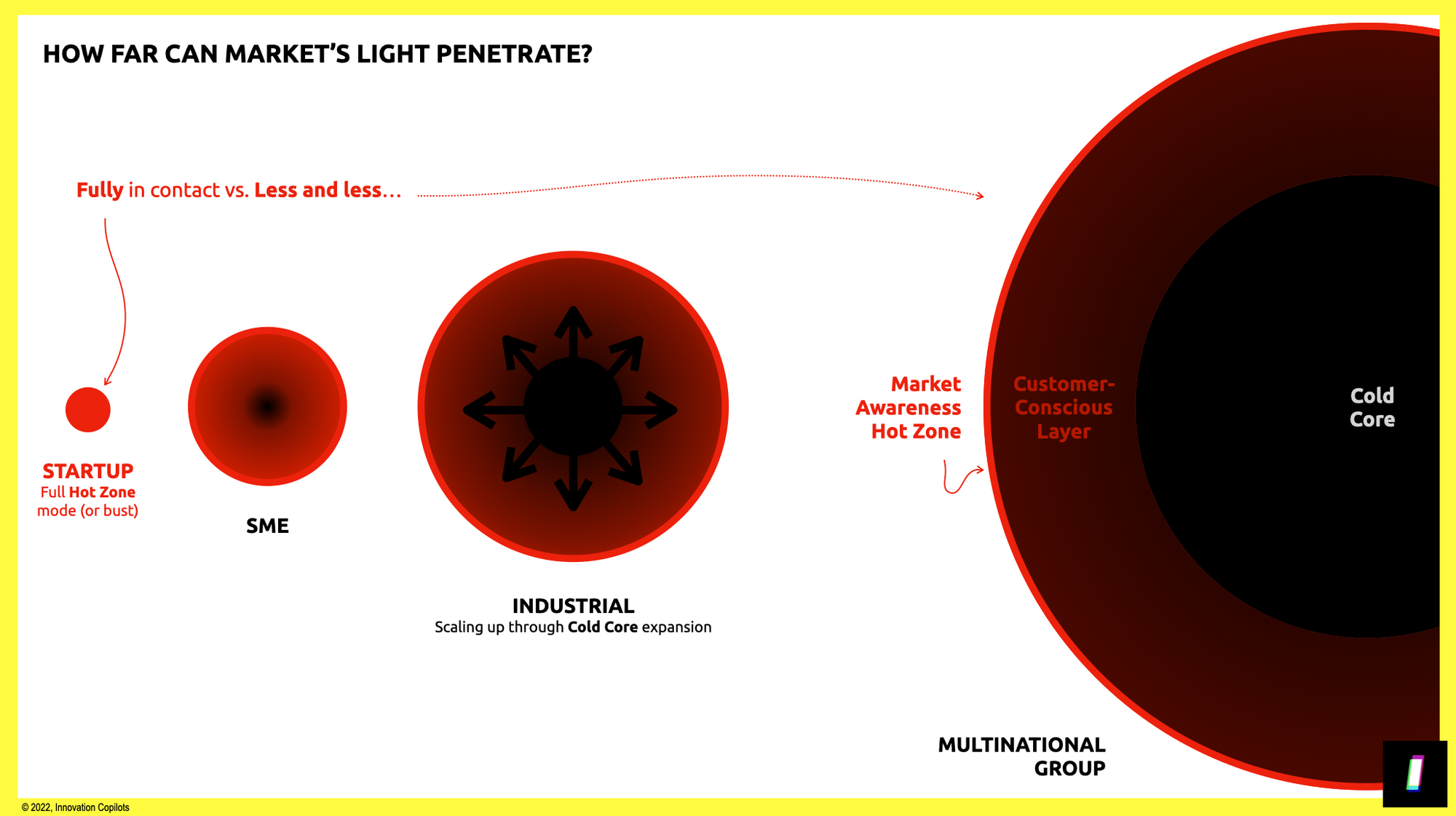 That being said, there's a general principle that size does matter. From startups to multinational groups, the hot zone of full market awareness gets smaller and smaller as the number of employees explodes upward.