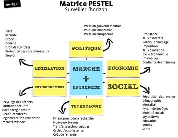 - Le PESTEL est souvent un excellent moyen de prendre du recul sur son industrie et son marché, en repassant en revue les points clefs qui la favorise ou la freine. C’est parfois le début efficace d’un travail de re-segmentation de son marché, ou de recherche d’océan bleu. C’est l’un des nombreux outils qui permettent de sortir des réflexes conditionnés que le chef d’entreprise a développé.