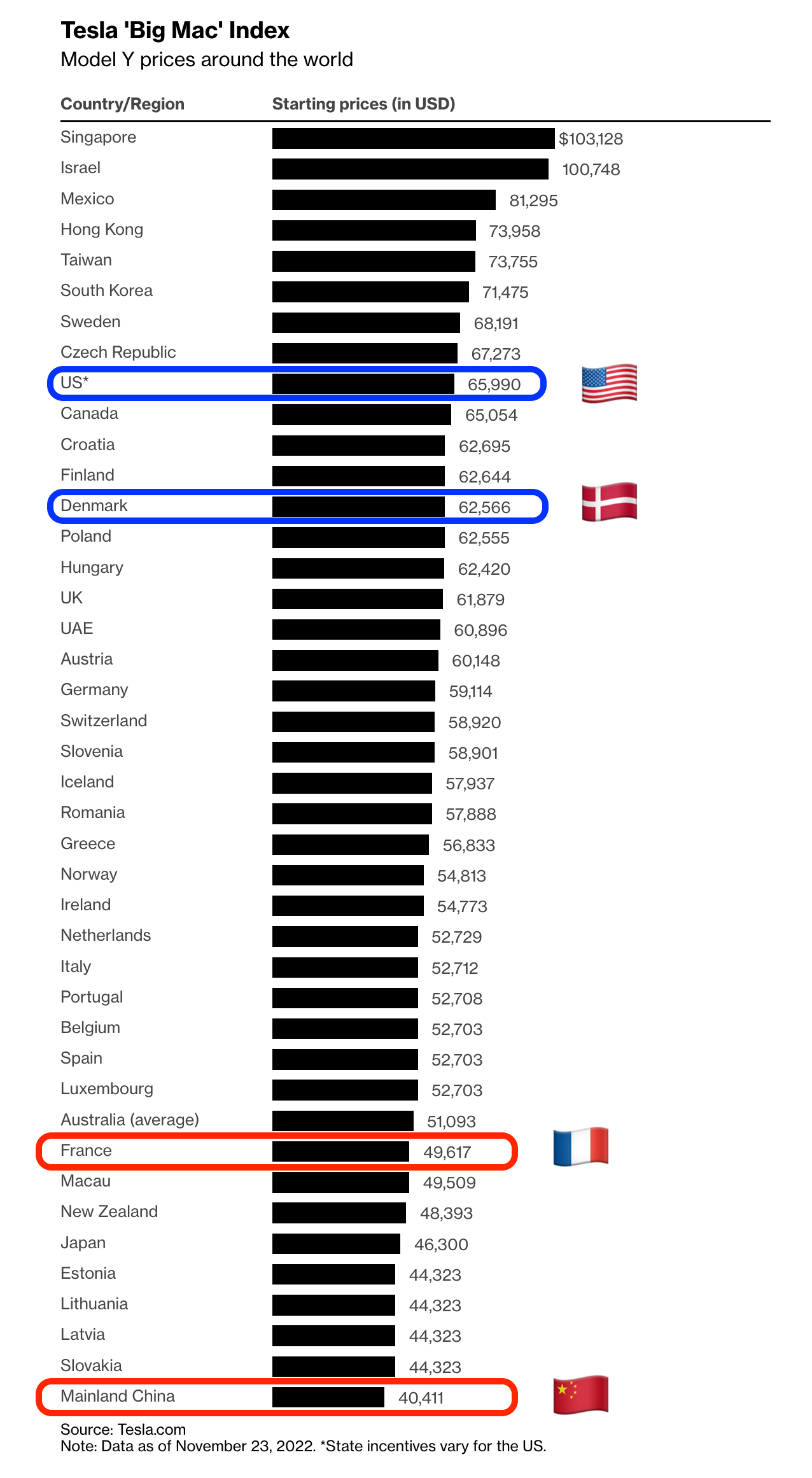 We can see, for instance, that a Model Y in France is closer to the price in China rather than in Denmark or the U.S.