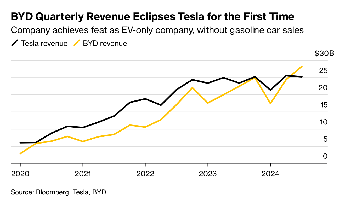 BYD was founded in 1995 in Shenzhen as a battery manufacturer. In 2003, they took over the Chinese state-owned Tsinchuan Automobile Company and started working on eletric vehicles. 2003 is exactly the year Tesla was founded too. It took +20 years but BYD now surpasses Tesla in worlwide sales.