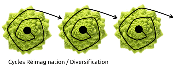 Elle fait table rase, remet les compteurs à zéros, non pas pour aller ailleurs, mais pour revenir exactement au coeur initial du cycle d’innovation qui était apparu au départ. On ne Réimagine pas le marché ailleurs ou autrement, mais on reste complètement dans celui-ci en supprimant le foisonnement de Diversifications qu’il y a eu pour ne garder que ce qui sera le plus puissant, le plus pertinent pour les prochains 10 ou 20 ans.