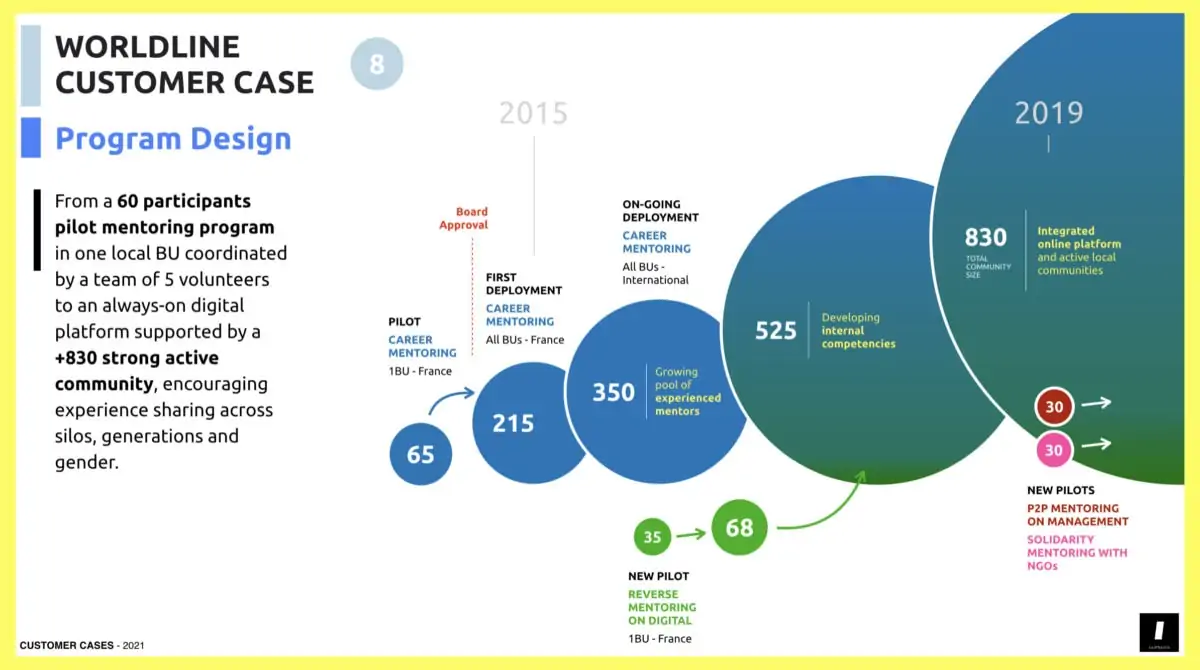 Below is an infographic to illustrate this growth over several years. It shows how we started at Worldline from a narrow segment of employees, added different themes and logic organically, and ended broadening the impact to a large part of the teams.