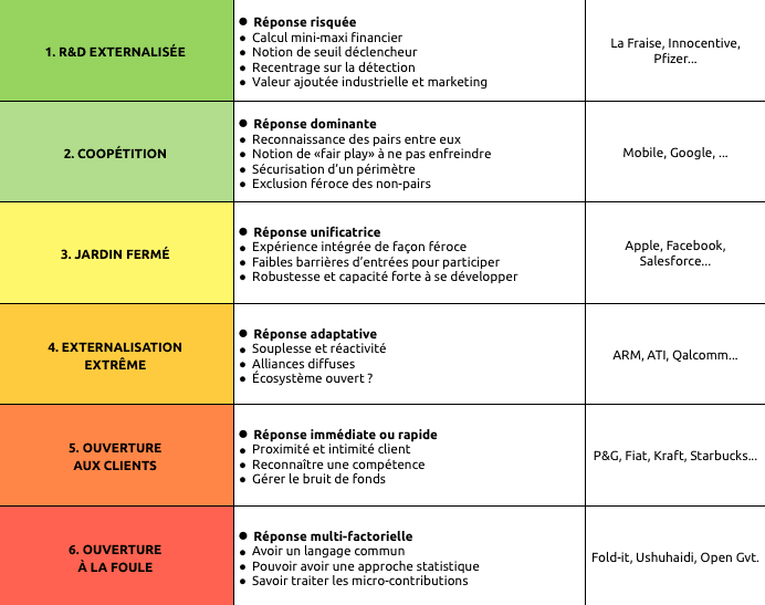 Je donne demain un cours à l’ENSCI sur l’open innovationet plus tard sur l’innovation de modèle économique. Profitons-en pour prendre note au passage que bien peu de grands groupes prennent le temps de comprendre les différents paliers d’innovation ouverte. S’il y a de nombreuses façon d’aborder ces différences, je trouve assez intuitif de traiter ce sujet en fonction du degré d’ouverture que l’on va déployer. De façon systémique cela donne les 6 niveaux suivants :
