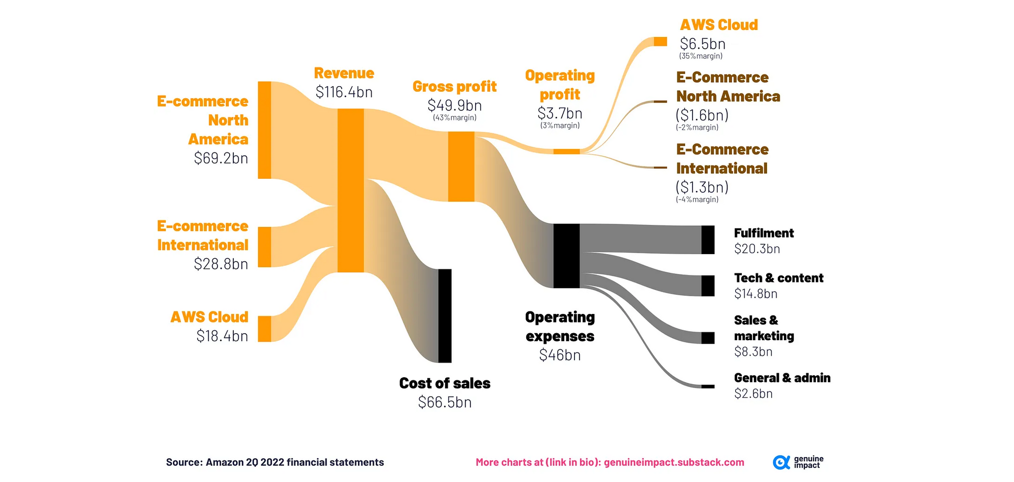 Amazon is another fascinating company with a particular margin strategy. While Apple is always going deep (profits), Amazon has had to deploy and sustain one of the largest network effect businesses worldwide since 2007. They had to go not only wide but exponentially wide (sales expansion prevailing on pretty much anything else).