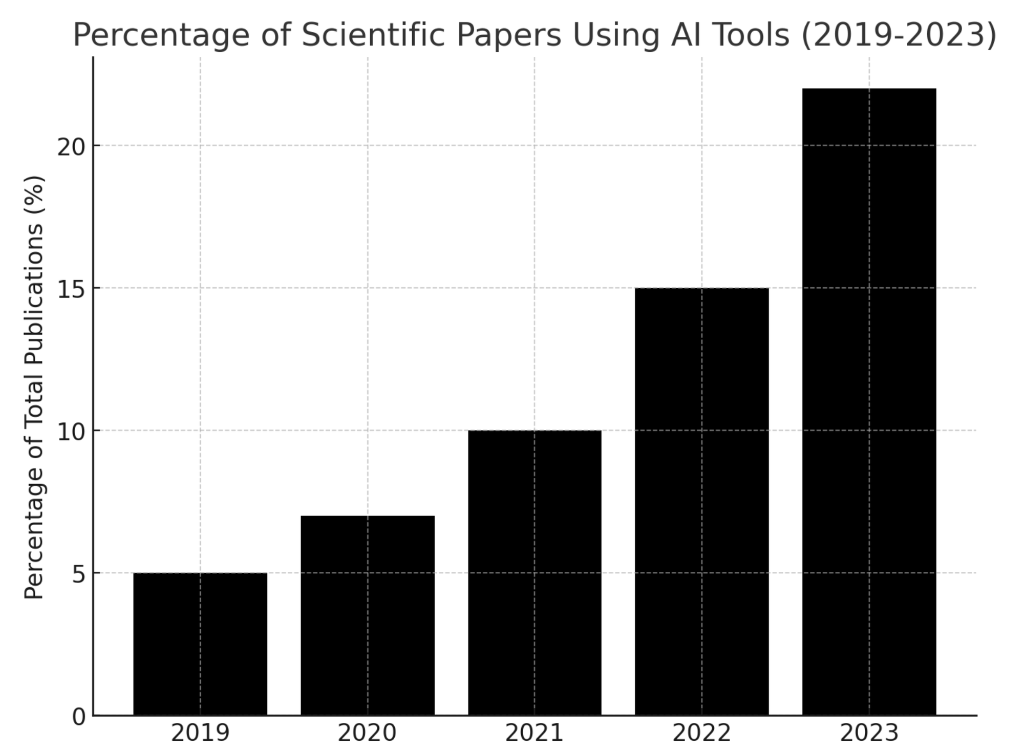 The percentage of scientific papers using AI tools has increased significantly over the past five years. Research shows that AI has been increasingly integrated into various scientific fields, especially in areas such as pattern recognition, machine learning, and biological sciences like genomics and proteomics. For example, the share of research papers mentioning AI terms has doubled since 2015, with the rise in publications focusing on AI-driven discoveries and applications across disciplines.