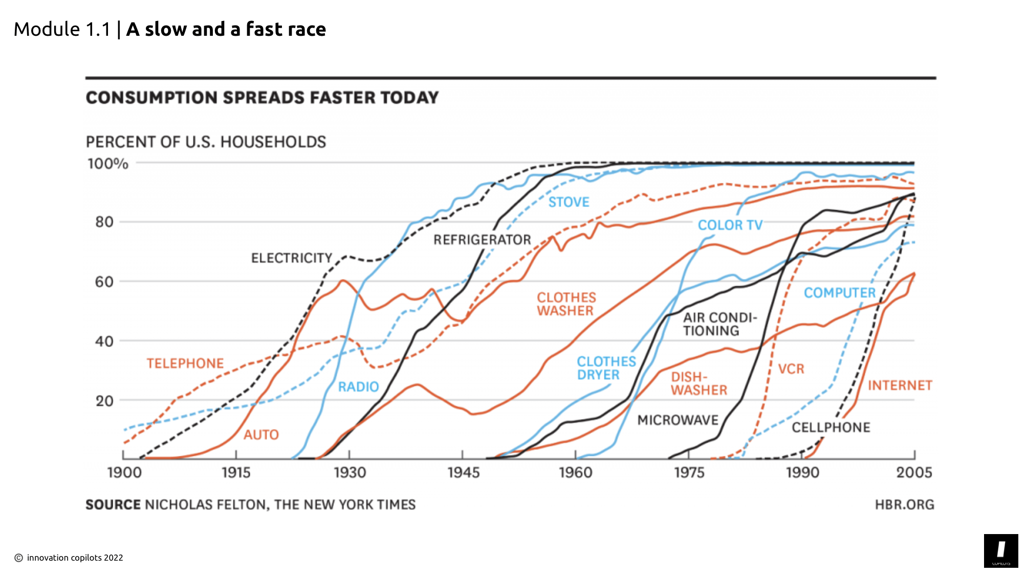 It's a usual trope around technology and how it gets more and more momentum and easier market penetration as time goes on. One of the most know charts is this sort of comparison, starting with the first landlines to the internet: