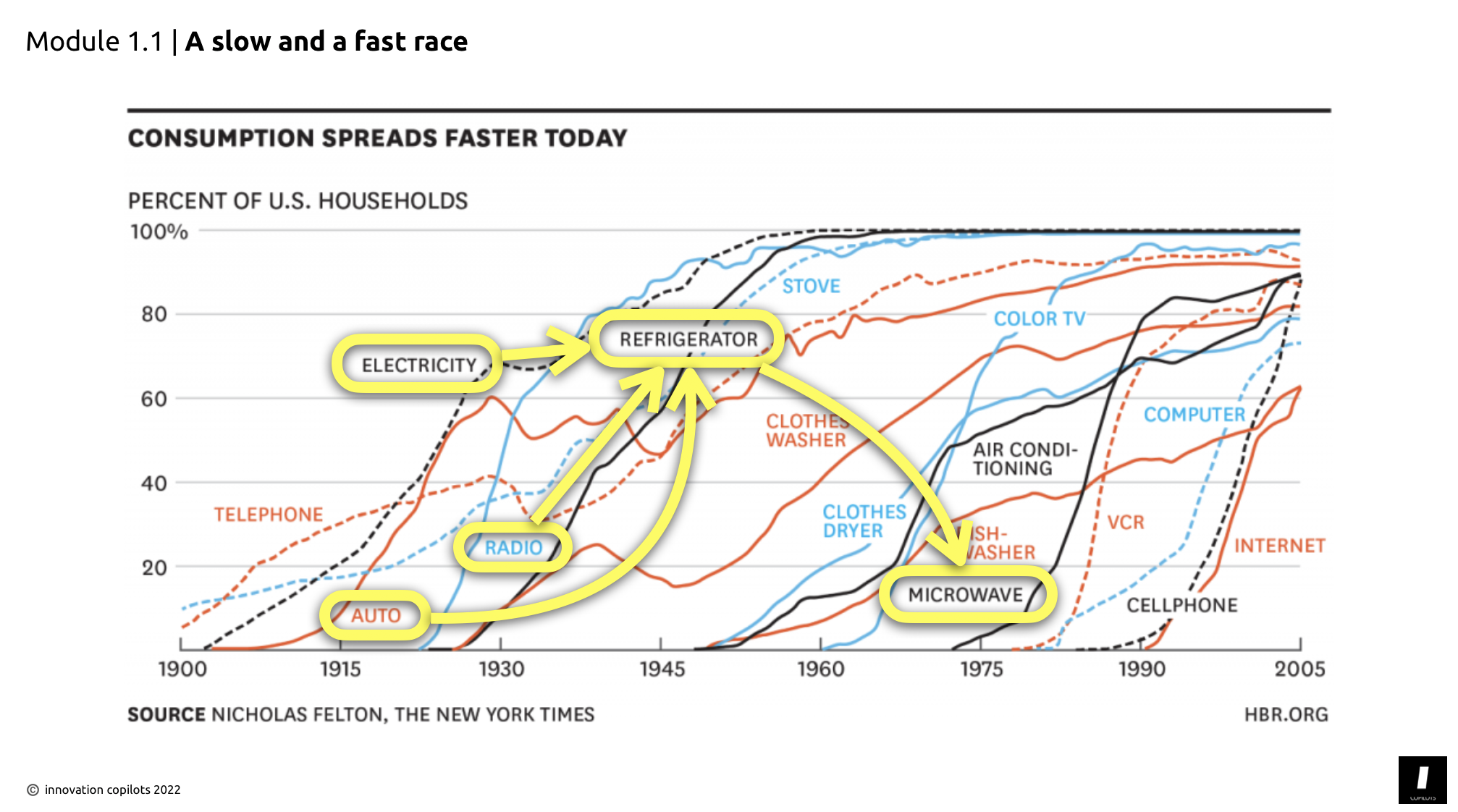 After the industrial revolution, the speed at which refrigerators penetrated the market depended on radio ads to promote this new consumer technology, a pervasive electricity grid running in the suburbs, a network of supermarkets pushing for the need to store a whole week of food, and most importantly, a car to get to the supermarket.
